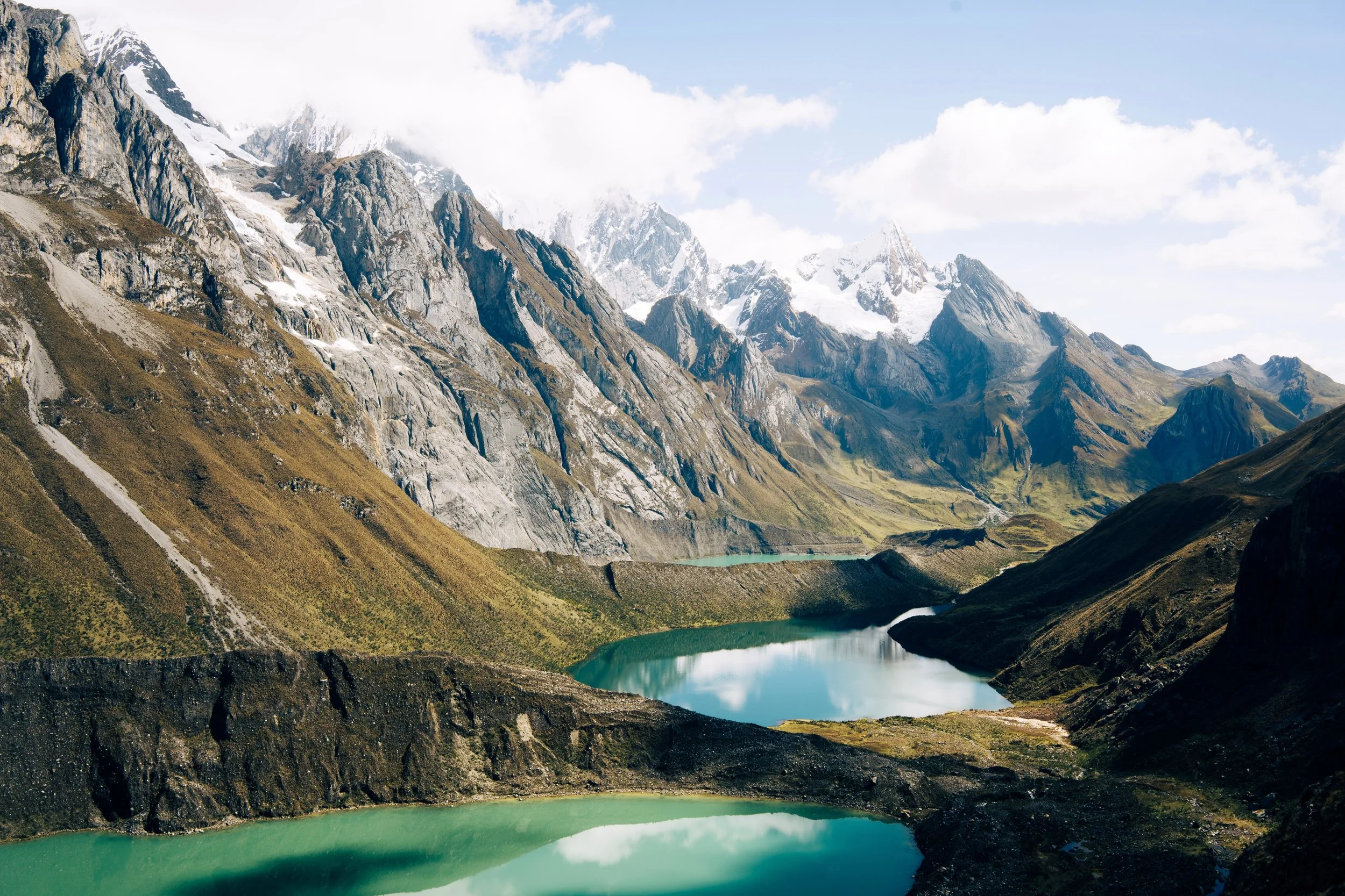 I awoke to the sound of mules and shuffling feet. Porters, cooks, and trekkers had awoken early and were nearly out of camp. 6:32am and I rolled slowly and quietly out of the tent. “You awake?” I whispered to Garrett, wondering if he had the as rough of a sleep as I did. At 14,231ft I couldn’t of expected to sleep that badly, waking every other hour to just toss, turn, get comfortable fall back to sleep. Turns out this is fairly common, especially above ~10-12k. He rose and we started to break down camp and get brekkie underway. One probar each – banana nut bread with some instant pour over coffee. Coffee may have been the best part of the morning, with temperatures hovering around 25F it hit exactly how you’d expect it to. Took about an hour to pack - pads, sleeping bags, tent, supplies, etc. We applied a thick layer of zinc on the face and calves as the sun was out at this point and I could feel the warmth radiating already - it was going to be a great day. We were some of the last to roll out of camp considering we were the only ones breaking down our own tents and equipment. It was off to the races down the hill to track the south side of Laguna Carchuaccocha. Spectacular views gave way to an ablation valley and the steep and obvious climb up to the moraine just above one of the classic mirador’s of Huayhuash - the Tres Lagunas flanked by the jagged, icy peaks of the core of the range. Atop we hung with some Kiwi’s that were out for a boys trip on the circuit. We nearly passed every party that departed camp before us with a zest and motivation to keep moving. “God damn, this morning’s climb was beautiful” I said to Garrett. We grabbed a few photos on the moraine, awed the inspiring peaks and continued down to drop into the marshy valley that slowly sailed and weaved through long, grassy knolls along steep green mountain sides. The walls couldn’t have been more impressive along the mountain slopes, what was the driving force behind these walls? Surely most of them date back to the Incan period - immaculate and solid walls in perfect form like a wonderful unison grasses swaying and standing in the wind.