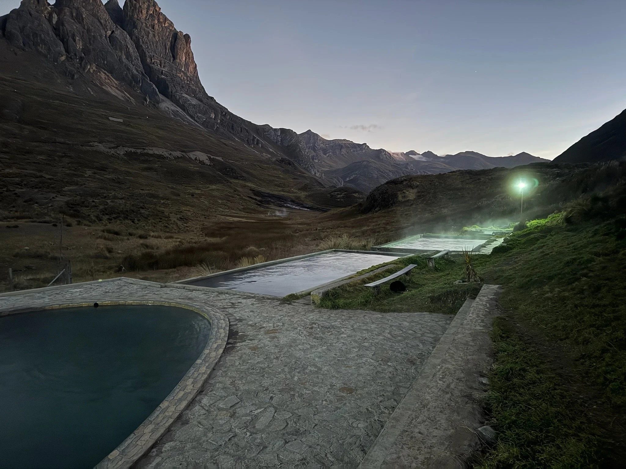 We criss-cross paths and start descending aggressively, skidding the rubble loaded mountain side where the sun hides behind and it becomes darkened. The wind picks up and within a matter of minutes the temperature dropped and gust got up to 20-30mphs. I couldn't even hear Garrett unless we were side-by-side. It was nearly 3:30pm and we were feeling the grind of the day. I stop to toss on my down jacket and Garrett does the same. We continue traversing down with Lagun Viconga becoming everclear in the distance past us. Suddenly with haste runs a herd of Alpacas to our left along the scree field up ahead. A few minutes later, more and more come into view and we paused. We looked around to see nearly 100+ Alpacas ranging along the hillside and to the left near some chozas and corrals. My assumption was that this was a wild herd that roamed this area, it was something special to see this many out there, free. In the chaos of this all, high winds, alpacas flanking us, and a descending trail, something sinister happened and I wouldn’t find out until about an hour later. We finally make our way down and then up a short uphill to the lakes moraine crest with a junction down - one way to the Agua Termales at camp or the other to Punta Coyoc. Our goal was the Termales and camp for the evening. We quickly hiked down and passed the deserted Voconga camp denoted on the map - somewhat strange to see it so empty as I thought this was a major setup point. We rolled into the Agua Termales campo and greeted the cobrador with his family and a few rubble shacks. The pools were steaming in the cold wind and it was like a hallucination in a dry desert to see these hot bodies of water welcoming us. There was one other party here still - a party of about 8 from Israel whom we weren’t the fondest of. We’ve seen them at our first hostel in Huaraz and they couldn’t have been more rude with their noise, trash, and hospitality. After chatting to one, they were luckily bowing out early and hitching rides the following morning from an apparent dirt mining road with car access to the campo. Regardless - we quickly undressed and hopped into the pools with the cool setting sun off to the west.
