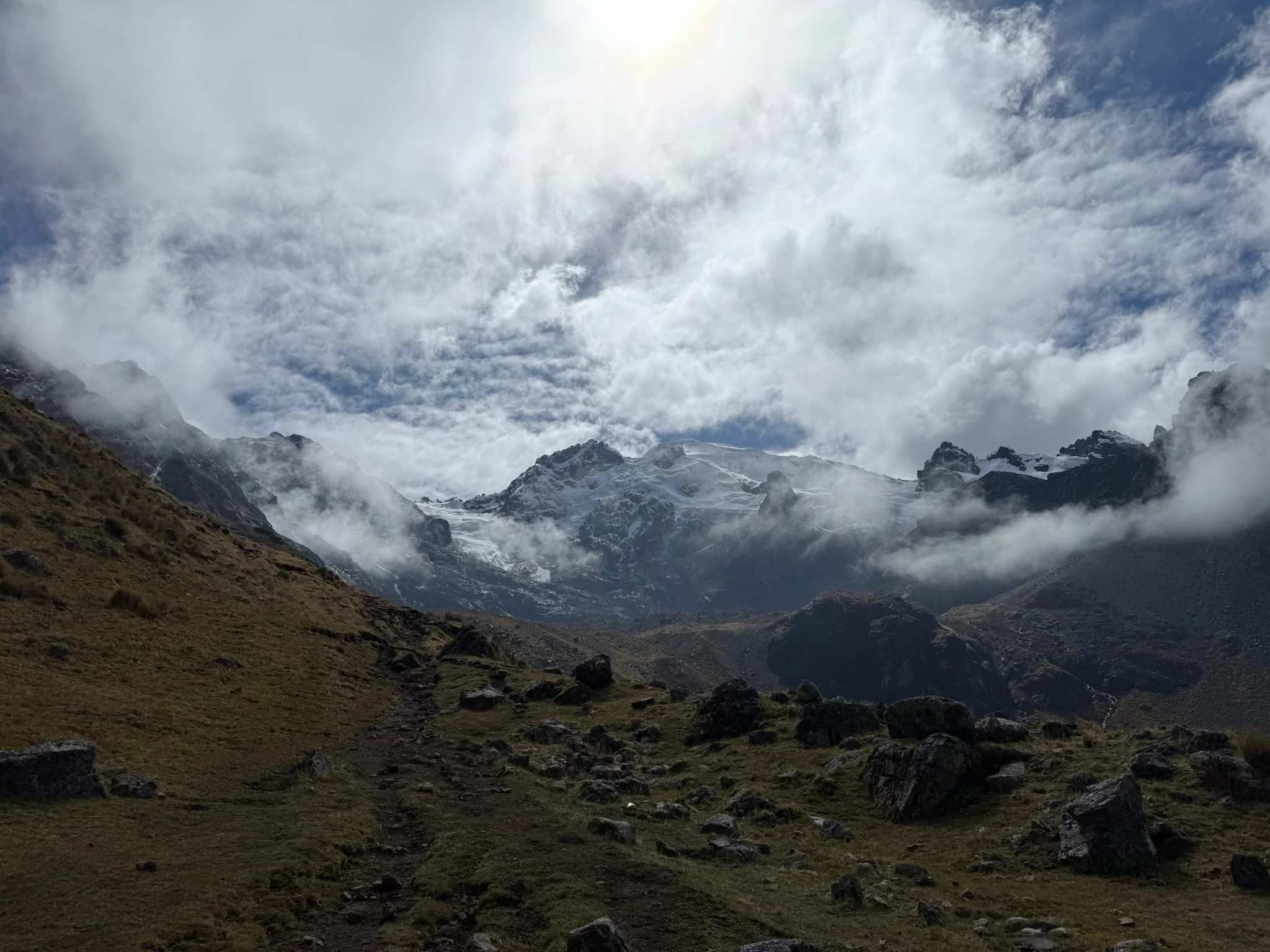 As the crowds cleared at 15,570ft we hit our high point of the day thrilled but gassed from the big push. Garrett threw in some coco leaves to help relieve the pain of the climb and ease us into a descent we were cautiously thinking about. The view from the high point was awe inspiring with a view of western peaks of the Huayhuash rising through the horizon with towering snow capped peaks and deep valley floors. At this point the sun hid behind the clouds and the clouds thickened as we walked, hoping for no rain and just some cover up above. Tights and a long sleeve went on and we kept chugging down the trail, ended up in the camp in about an hour. Once in, it was deserted except for a few campesinos roaming and one guiding outfit pitching tents. We found a bathroom with running water out in a field with three walls - we jumped in to get out of the cold breeze to put on windbreakers and eat lunch. Down went a cliff bar along with more scratch. We filtered water and readied ourselves to finish the day. We paid the fee collector and told them of our plans. On the map, the trail seemed to diverge a bit round Laguna Susococha north of the camp. The western route seemed to be the best and well trottened trail so we stuck with this versus the one we could see on the east side of the trail. The fee collectors sounded weary of our plan as we tried to rely to them we were headed to Llamc today. They ended the conversation joyed we paid them and pointing us north to the trail. Theoretically, it was mostly if not all downhill from here but I figured something may be up at some point in the trail as our gps track seemed to show a significant climb right at the end before the push into Llamac.