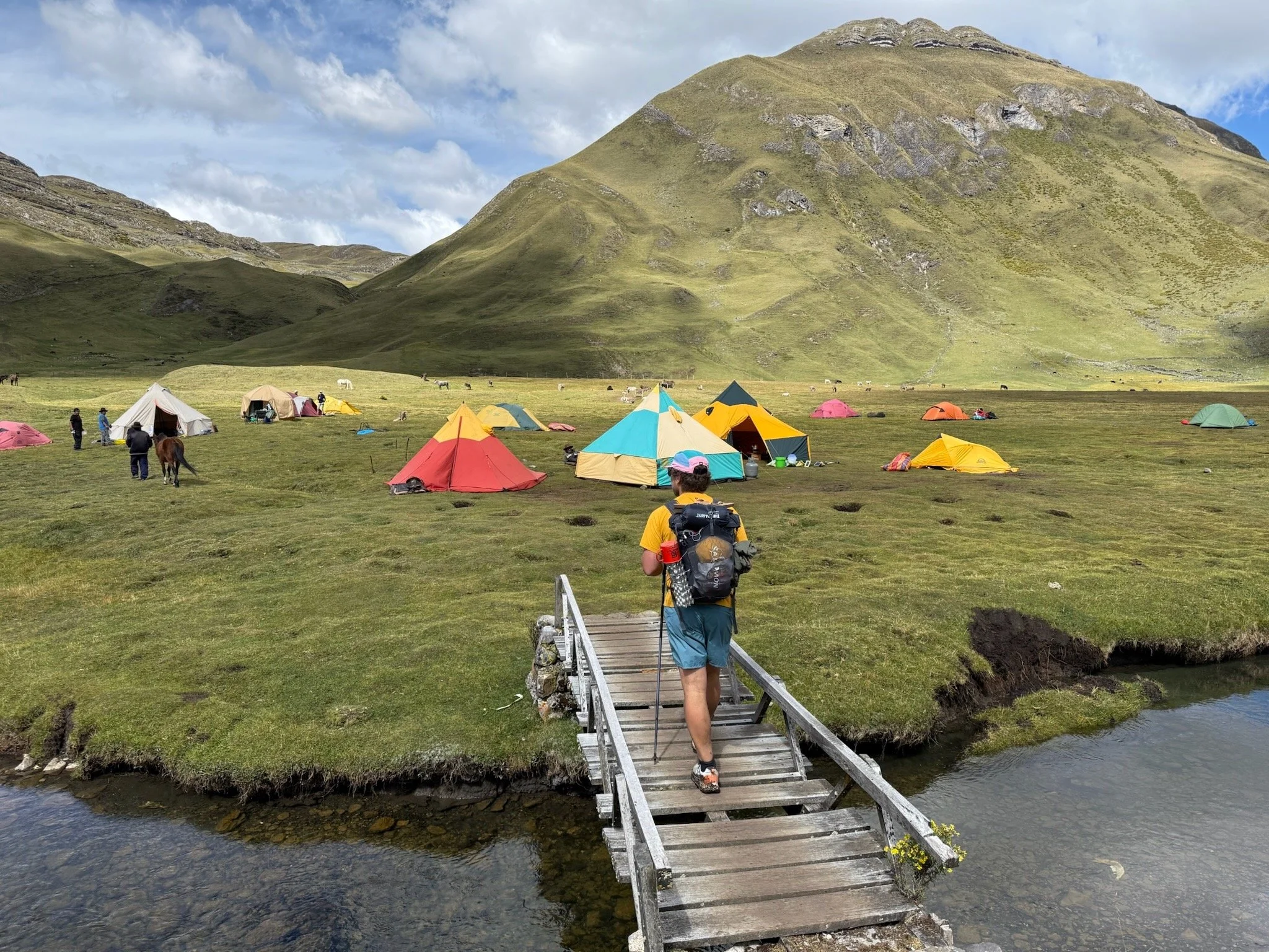 Excited with our entrance tickets in hands, we begin up the trail which abruptly becomes steep to the point of a slow hike uphill with the weight of our bags really pulling us backwards. Confused by where the campo actually is, we continue onwards until a junction with a sign flashing an arrow west and down to Huayllapa. We shuffle down another steep, loose trail being passed by an old Quecha man with a 30+ kilo load on his back, presumably from another village into the what opens up another door to a trotten path, now widened to nearly a small road, The mountainside gives way and we can see a large village below just above the river. We make our way in and feel immediate relief and excitement, I had no idea Huayllapa was anything more than a few rubble shacks and a campo. Complete with a few hostels and a couple of small tiendas stocked with snacks, junk food, and farming tools it felt bustling in nature but still devoid of people. The guidebooks mentions the campo being an old soccer pitch and we finally find it behind a massive stone wall atop the street. We walk into the arena and it felt like entering the colosseum, walking onto a massive stage being the endpoint of the day.