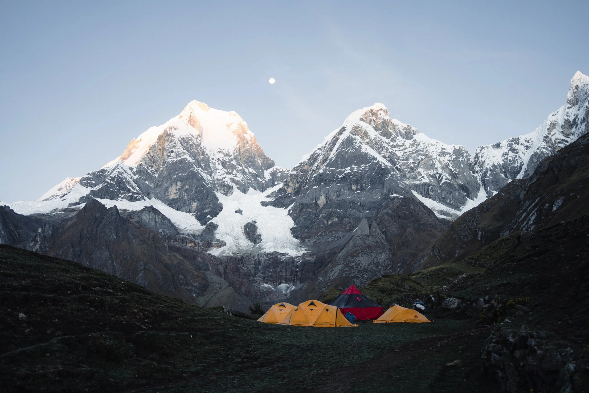 From here, we pushed the climb and it felt like we were going to be on this climb for hours. Miles turned into another few hours and we found ourselves finally descending the backside of the climb (Punta Carhuac 4650m) to a tapered drop with stone walls lining up the mountainside from what looked like a grassy knoll once occupied. Up until this point in the trip, and in the Huayhuash it was incredible to see the craftsmanship put into the stone walls and the seemingly perfect alignment of stones that have sat for hundreds of years untouched and in solid form. Something truly mind boggling as it hurt trying to grok the effort this would of taken when it was performed by the Quechua’s. After the a bit of some more moving we made it to a rocky knoll where the distant white peaks began to seem closer and closer. Did we suddenly rock up to the side of the high peaks? It sure felt like it - we rolled over the knoll and below could see Laguna Carchuaccocha and the Campo Carchuaccoha with three distinct areas with tents pitched. The view over the shoulder to the west was breathtaking. Front and center we could see in near entirety the core of the Cordillera Huayhuash - Ninashanca, Jirishanca, Yerupajá, Siulá. Sitting just above 20,000ft or 6,100m in perfect clear skies. It was truly one of the most breathtaking views I’ve had the honor to be in front of. The lake sat just below the heel of Jirishanc and couldn’t have been more picturesque. Garrett and I, relived after a 22 mile day found a spot to pitch the tent near another group of tents and got to work on photos, reveling, and setting up camp for the night. Our tent system worked well and it was off to boiling water for dinner - Beef Stroganoff with a side of hot water in a cup. Delicious. We ate dinner, looked at the setting sky above the peaks, and barely spoke many words. We were worked from the long day and emotion of starting the fastpack. Temperature dropped and we found ourselves fully dressed in pants, down jackets, and hats. By 7pm, it was time to shuffle into the quilt and head to sleep at 4,150m (13,500ft).