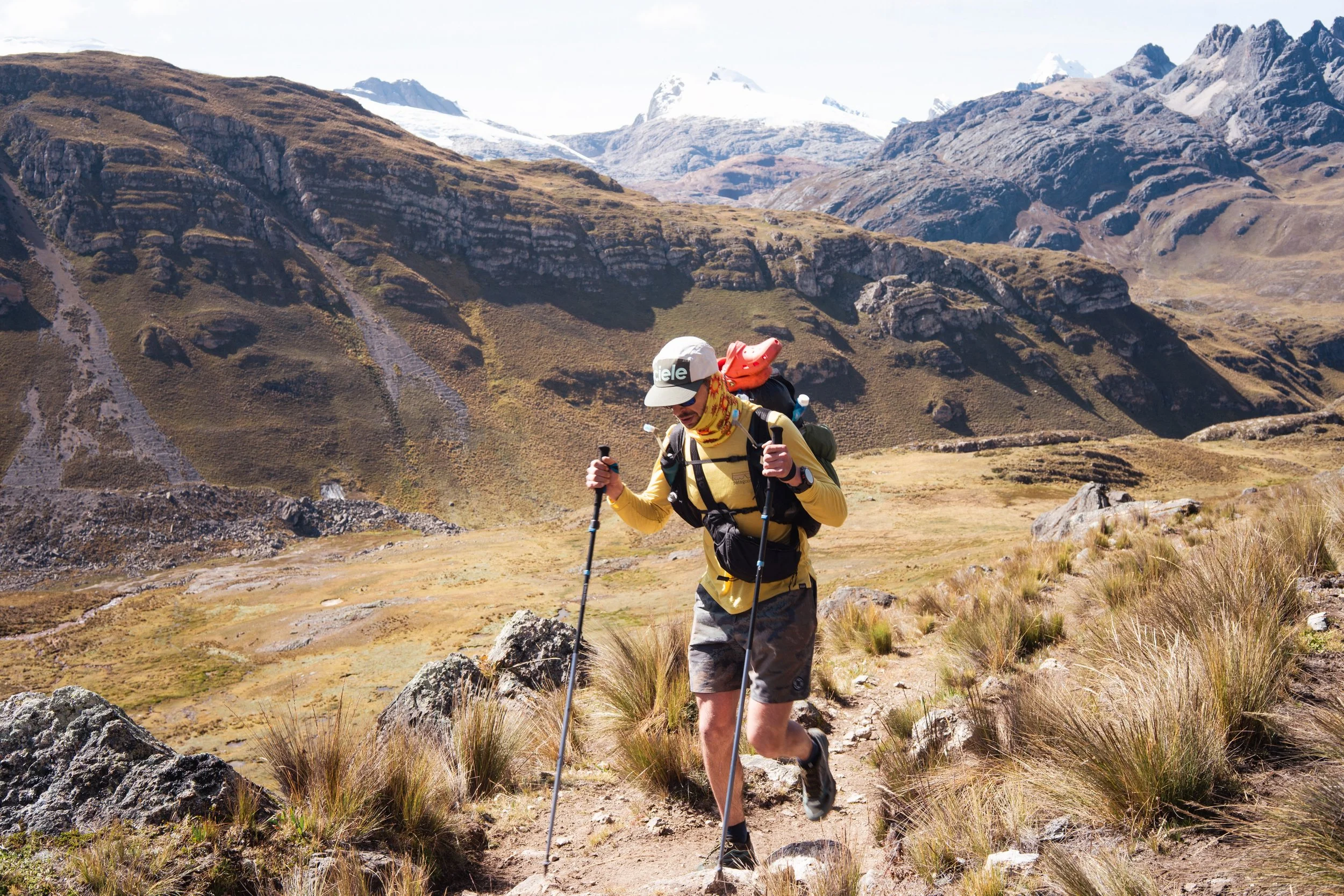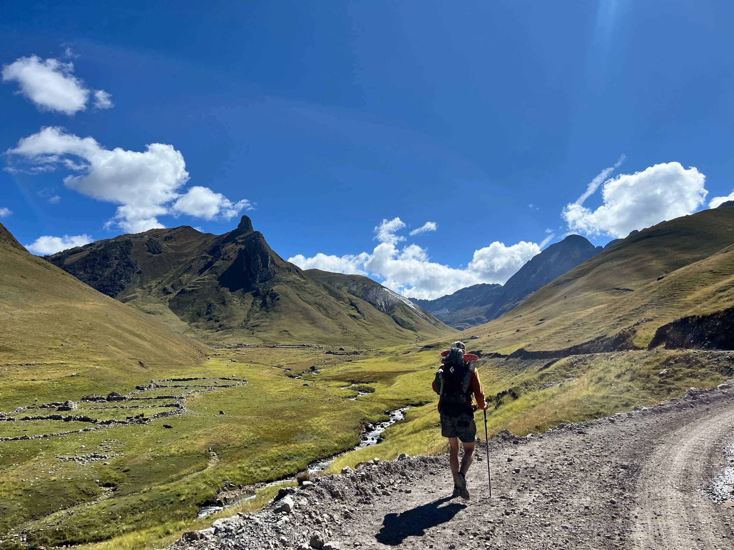 Garrett and I blast up the trail and it’s quiet out there. Once we pass the Croatian whos headed out before us, it was a steady climb up some winding trails to the north east and finally up to Paseo Cuyoc (16,650ft) as the high point of our route. I beat Garrett up there with a show of force and agility pounding up the final half mile above 16,000ft. Somewhat surprisingly the altitude was feeling more manageable and better, albeit still tough on the lungs and weighing on the legs. The sun was blasting at this point and it was warm and dry. The view up was spectacular as we made our way, with views of the Cuyoc (17,716ft) and Puscanturpa (18,543ft). We observed a party making its way down Cuyoc and possibly headed to Viconga but more likely Campo Elefantepama which was the next camp on our route west at this point. We took in the views, snapped a few photos, ate and drink bit and looked onwards where the trail seemed to file off the mountain and down and endless sloped horizon flanked with snow capped peaks to the south. We began out descent which was slightly scree filled initially and began to stabilize with larger boulders and rocks underfoot and an obvious trail. This brought us down into a long, luscious valley with some cows grazing to our right and Incan-era stonewalls lining the southern border of the valley. We continued down until the trail leveled out and it was a nothing more than a gradual walk down the horizon. We passed campo Elefanta Pampa and snapped along the ridge looking down and thinking about our route. We finally came to a section of the trail level with the water source which had been flowing from high valley streams and runoff now middling through the valley. We eat a snack, filter water, and take in the midday sun. It’s hot enough now that I reapplied zinc to my face and pulled the hood up and over my neck so as to protect it although it’s been days with this sun and elevation and the damage has probably been done at this point.